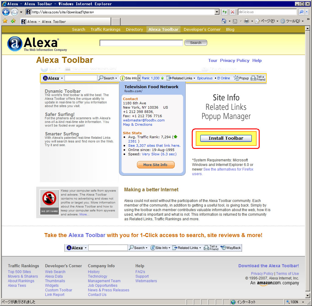 配布ページの"Install Toolbar"をクリックしてください。Alexa Toolbarの対応しているブラウザ(WindowsのInternet Explorer6.0以降)であれば、インストーラのダウンロードが開始しますので、このファイルをどこかへ保存してください。