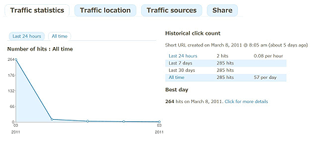 Yourlsには簡単なアクセス解析機能が備わっています。こちらの機能を紹介いたします。(アクセスするには、各リンクの右端にある棒グラフのアイコンを押してください)