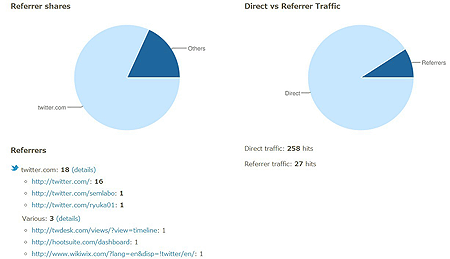 最後にクリック元です。右側で、「リファラーあり(Referrers)」あるいは「リファラー無し(Direct)」かが分かり、Referrersの内訳を左側の画面で確認できます。