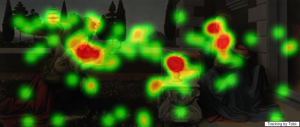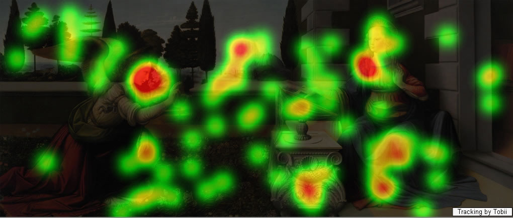 といったように、長く閲覧されているエリアに違いが見られ、図2では、事前に読んでもらった解説文に書かれていた内容が閲覧結果に影響していることがわかります。このように、被験者の目の動きは、どういった流れで絵を閲覧しているのか?(今回の例のように、作品解説を読んだ直後に閲覧したなど)といった「コンテキスト」や、画面を見ている際に、何を探しているのかといった「目的」、すでにそのものを知っているのかといった「経験、知識」などによって異なるといえます。
