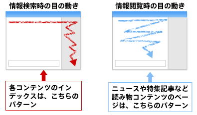 少し考えただけでも、いくつかのパターンが思い浮かびます。例えば、情報検索時は左右のナビゲーションエリアを、情報閲覧時はメインコンテンツエリアを視線は動きます。