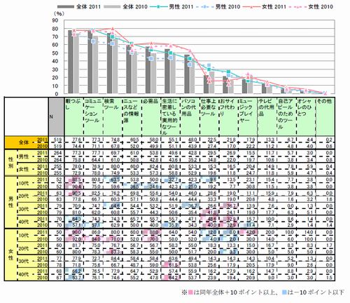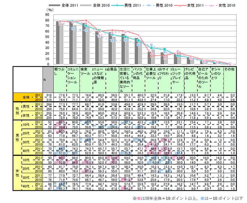 モバイルユーザーにとって、モバイルはどのような存在か尋ねたところ、最も多かったのは「暇つぶし」(78%)、次いで「コミュニケーションツール」(77%)、「検索ツール」(75%)となりました。一方、「仕事上必要なツール」「ミュージックプレイヤー」は昨年より5ポイント程度減少していることから、モバイルをこのように捉えていたユーザーはスマートフォンに乗り換えている割合が高いのではないかと推測できます。