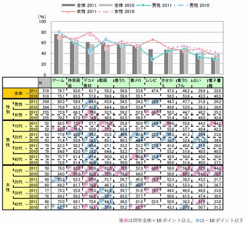 性年代別に見てみると、最も多くのコンテンツを利用しているのは女性10代ですが、「着メロ」「着うたフル」「占い」「電子書籍」の利用率は昨年に比べ10ポイント以上減少していることがわかりました。