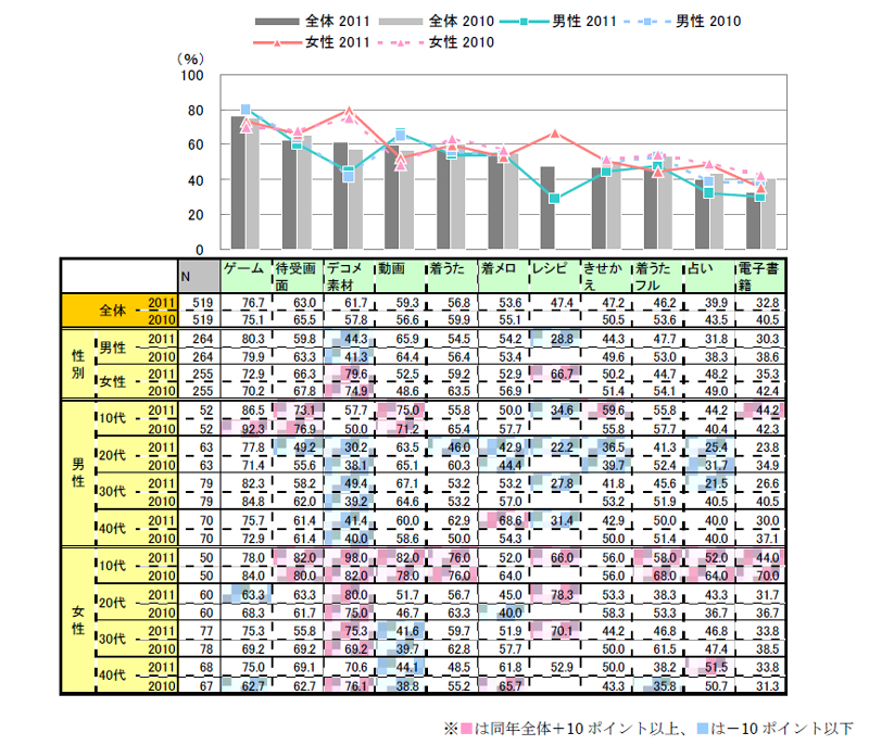 「占い」「デコメ素材」は有料コンテンツの利用率が昨年より増加