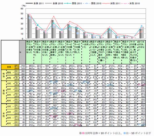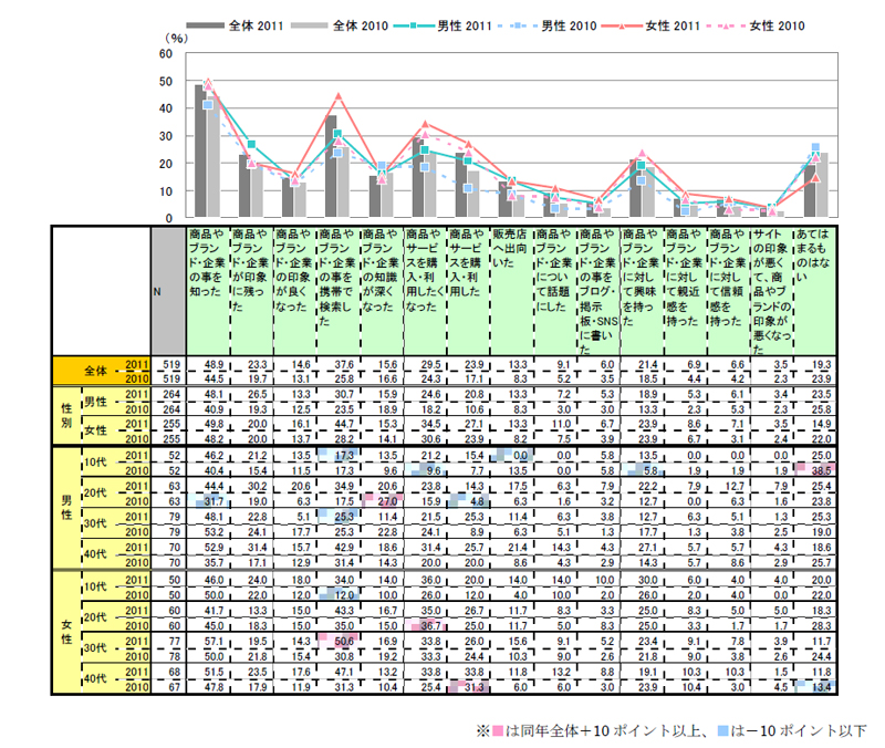 モバイルサイトを閲覧した後に経験したことのある感情や行動について尋ねたところ、「商品やブランド・企業の事を知った」(49%)が最も多く、次いで「商品やブランド・企業の事を携帯で検索した」(38%)、「商品やサービスを購入・利用したくなった」(30%)となりました。昨年と比べると、「携帯で検索した」が12ポイント、「購入・利用した」が7ポイント、「購入・利用したくなった」が6ポイント増加しており、モバイルサイトが商品・サービスの購入意欲の向上に、さらに影響を与えるようになったと推察できます。