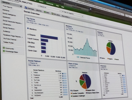 その下は、プラットフォーム(Twitter、Facebook、LinkedIn、YouTube、Delicious、Digg、MySpaceなどのソーシャルメディア)別のメンション数だ。中央の上段は、キーワード群の全体のメンション数の時系列トレンド、その下は競合とのメンションの比較パイチャートらしい。右上はセンチメント、右下はインフルエンサー(影響力があるユーザー)のリスト、と各種情報のブロックが並ぶ。