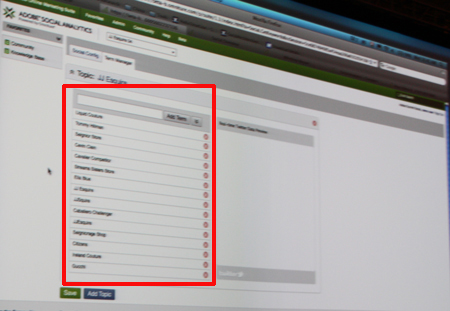 まずは、モニタリング対象のキーワード群を登録する。AND、OR、NOTなどで複合的な条件指定も可能、ということだ。画面左側で指定したキーワードに合致するツイートが、画面右側にリアルタイムで表示されていく。