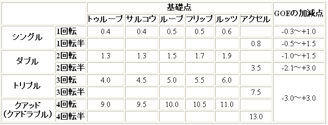 上表がジャンプの得点一覧である。それぞれの基礎点にGOEが加減される。さて、4回転を跳んだのは安藤美姫ひとりであるが、最近は非常に不安定で成功させていない。さらにトリプルアクセルも中野友加里の成功率は低い。となると現役女子でジャンプ最高点は浅田真央のトリプルアクセルということになる。GOEが±0と仮定して、前半なら「7.5」後半ならば「8.25」である。次に高得点の三回転ジャンプであるトリプルルッツでも、前半「6.0」後半「6.6」に過ぎない。