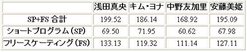 競技者全員がジャンプで回転不足や転倒もなく、スピンやステップも無難にこなしたすれば、机上の計算ではトリプルアクセルを成功させた浅田真央の優勝である。現実の成績もそうなっている。彼女はISU世界ランク1位である。また下表のパーソナルベストを一覧してみても、浅田真央はショートプログラムを除いて2つ世界最高となっている。