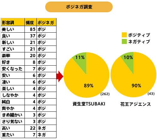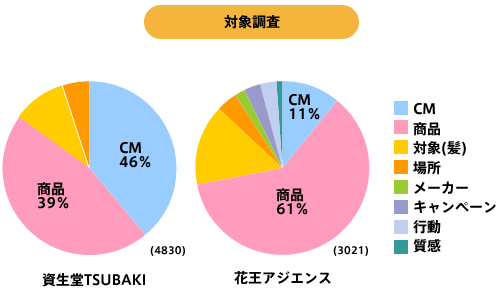 こうしてみると資生堂TSUBAKIも花王アジエンスもポジネガの割合はほとんど変らないように見える。またこれを名詞に関して分類すると資生堂TSUBAKIにおいてはCMに関する言及が多い(46%)のに対し、花王アジエンスはCMに関する言及は比較的少なく(11%)、商品について多く述べられている事(TSUBAKI39%に対し、アジエンス61%)が分かった(【図3】を参照)。