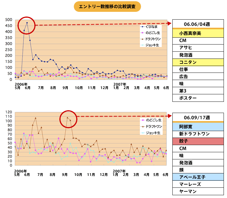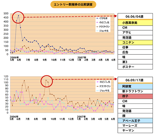 【図4】の青いラインはアサヒの「ぐびなま」で、2006年6月においては他3銘柄を抜きダントツにエントリー数が多いことがわかる(他の銘柄におけるピークの5倍以上の頻度)。関連語を調べてみると、この時期に発売されたアサヒぐびなまのCMに出演した小西真奈美が話題の中心となっている事が分かった(【図4】右の表、黄色のハイライト)。