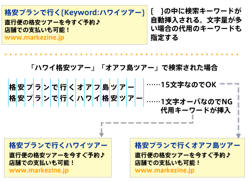 検索キーワードが「オアフ島ツアー」の場合は「格安プランで行くオアフ島ツアー」(15文字)が広告タイトルとして表示。しかし、検索キーワードが「ハワイ格安ツアー」だとタイトルの文字数が16になるのでNG。そのため補完テキストである「ハワイツアー」が自動的に挿入されるのだ。