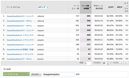 最後に下の方でフィルタを使って「Google Analytics」がページタイトルに含まれるデータだけを抽出しています。これがFilters(フィルタ)になります。つまりデータを生成する際に、どういう条件で絞り込むかということになります。