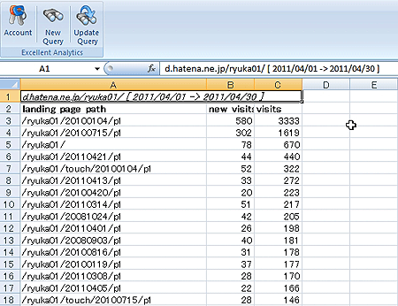 残念ながらExcellent Analyticsでは率の数字が出てきません(Google AnalyticsAPIの仕様が起因です)。新規率を出したい場合はExel上で、new visits÷visitsを行うことで計算ができます。また表の部分を範囲指定して、グラフを作成しておけば、毎日データを取り込むのと同時に自動的にグラフを最新化する事が可能です。