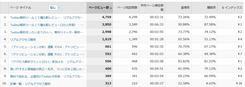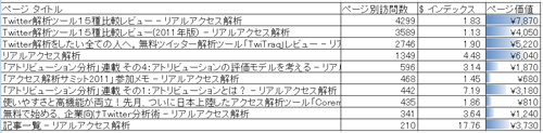 例えば10位の「記事一覧-リアルアクセス解析」を例にとると、「1セッションあたり約18円の価値」を生んでいるという事がわかります。この金額を「ページ別訪問数」で掛け算してあげる事で該当期間のページの価値がわかります。上位10記事の「ページ価値」を計算したのが以下の結果です。