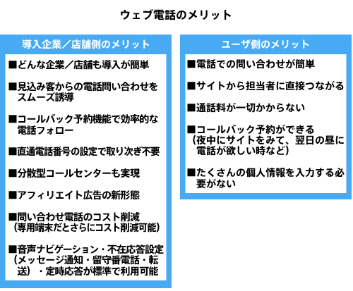 また、いままでWebサイト上でお客様の情報をもらおうとすると、氏名、住所から職業まで記入項目のやたらに多いフォームを用意してしまいがちだった。しかし最近のユーザーは、これだと面倒がって途中でやめてしまい、かえって見込み客を逃がしかねない。その点でも、電話番号さえ入れればすむという方式は有利だと言えるだろう。この他、ウェブ電話のメリットを導入企業とユーザ側に分けてまとめたので参考にしてほしい。