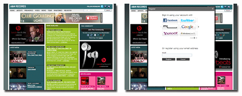 例えば、LADY GAGAが所属する「interscope records」のコーポレートサイトでは、所属アーティストの公式HPに、TwitterやFacebookなど各種ソーシャルメディアのID/PASSを用いてログインさせる、オープンIDの機能を活用しています。ログインユーザー限定のコンテンツや懸賞キャンペーンなど、ログインすることでユーザーはさまざまなメリットを享受することができます。