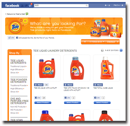 最近では、さまざまなソーシャルメディアにコマース機能がコネクトされています。例えば、P&Gは、「Tide」など各ブランドのページにて商品を販売しています。