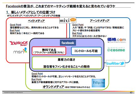3つのメディアとは、「ペイドメディア」「アーンドメディア」「オウンドメディア」を指し、それぞれ図のようなGood PointとBad Pointを持っている。その良いところをすべて合わせ持ったのがFacebookというわけだ。多くのユーザーが集まるメディアでありながら無料でページを持つことができ、ユーザー主導のクチコミサイトと違って企業が管理人としてコントロールすることも可能だ。