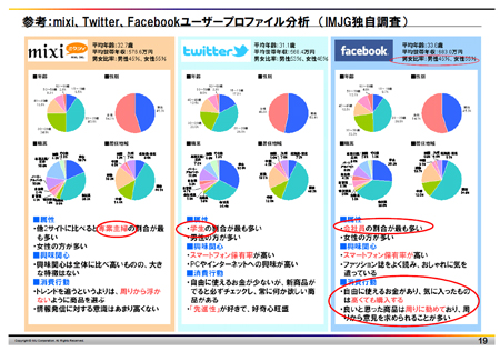 友人に良い情報を教えてあげたいという、親切な日本人の特性にもマッチしている。そしてsocialbakersのデータによると、Facebookユーザーの56%は25歳から44歳が占める。これは人口分布で見ると20%ほど高い数値であり、消費意欲の高い年代のユーザーが集まっていることからも、企業にとってのマーケティング価値が高いのだ。さらにmixiやTwitterと比較しながらFacebookのユーザー属性を細かく見てみると、会社員の割合が最も多く、平均年収も高いことがわかっている。(IMJ調べ)