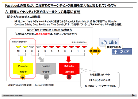 Facebookの「いいね!」や「シェア」といった、ユーザー自らが「推奨する」という行為自体、価値が高いということは想像に難くないだろう。このFacebookのシステムは、海外で多くの企業が導入しているNPS(Net Promoter Score)というカスタマーロイヤルティを測る指標とも非常に親和性が高く、ブランドにとって好意的でも否定的でもない、中立者のファン化に役立つとされる。