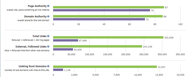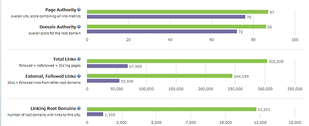 外部サイトから自分のサイトにどれくらいリンクが貼られているかを、リンク数及びドメイン数で確認します。大量のリンク購入などを行なっていないという前提であれば、高いほど好ましいです。他のドメインと比較したい場合は、ページを開いてテキストボックスの下にある「Compare This URL Against」のリンクを押し、2つのドメインを入力してから「Compare」を押します。