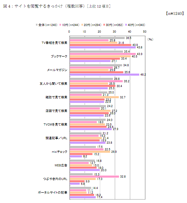 サイトを閲覧するきっかけを年代別で見ると、10代20代女性が「ブックマーク」や、「友人から聞いて検索」「mixiチェック」「つぶやき内のURL」が相対的に高いことから、自分が選別した情報や友人からの情報を重視してサイトアクセスしていることがわかります。一方30代40代女性は「TV番組を見て検索」、「メールマガジン」、「TVCMを見て検索」、「Web広告」、「ポータルサイトの記事」が相対的に高いことから、企業やメディアからの情報を信頼してサイトアクセスしていることがわかります。