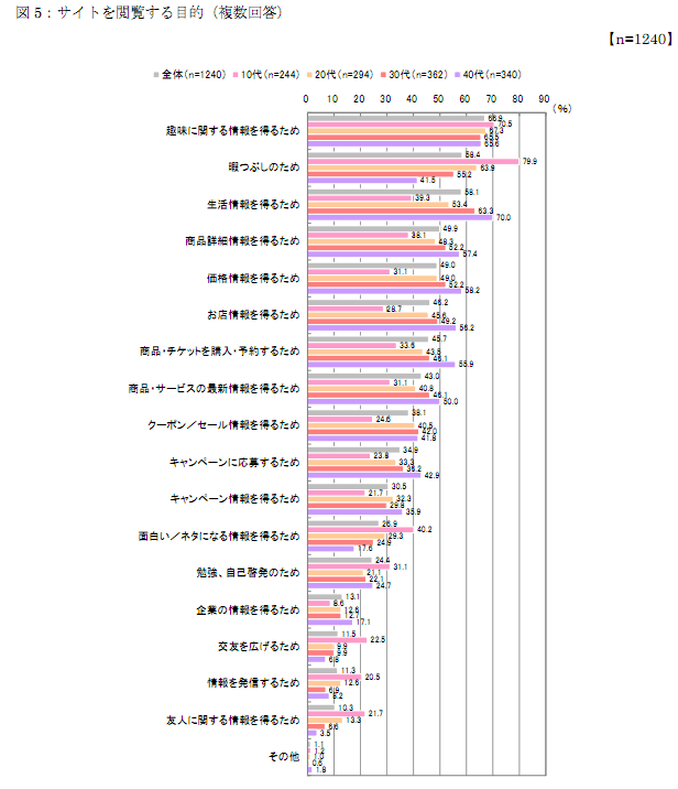 また、年代別に見てみると、10代20代女性は、「暇つぶし」や「面白い/ネタになる情報の取得」「友人に関する情報の取得」「交友を広げる」など友人とのコミュニケーションを目的としてサイトを閲覧する傾向があり、一方、30代40代女性は、「生活情報の取得」「価格情報の取得」「商品情報の取得」「お店情報の取得」「商品・チケットの購入・予約」などの日々の生活に密着した情報の取得を目的とする傾向があることがわかります。