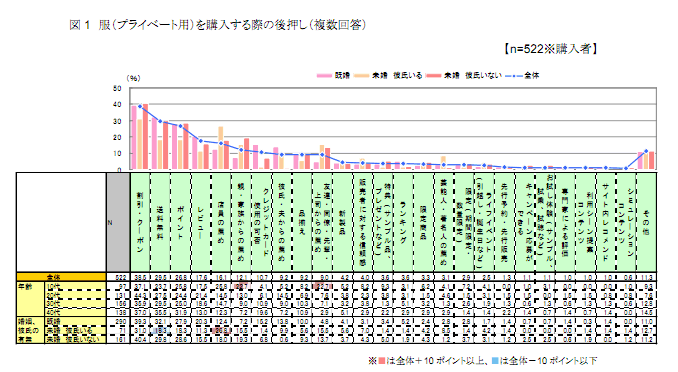 服(プライベート用)を購入時の後押しとなるものを尋ねたところ、「割引・クーポン」(39%)「送料無料」(30%)「ポイント」(27%)といった金銭的価値に直結する点を重視する傾向がみられました。年代別に見てみると、10代女性は「友達・先輩からの薦め」「親・家族からの薦め」「店員の薦め」といった顔の見える人からのオススメが後押しになりやすく、年代があがるにつれ、この傾向が見られなくなります。