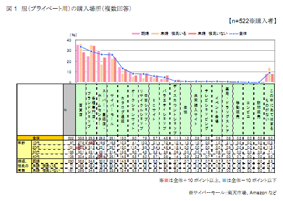 服(プライベート用)の購入場所は、「百貨店」「各種専門店」「スーパー・量販店」「サイバーモール」が主流
