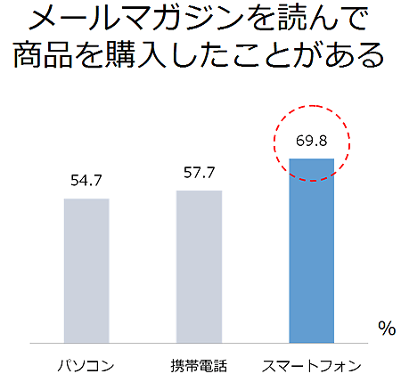 まず、「メールマガジンを読んで商品を購入したことがありますか?」という問いに対しては、パソコンでメールを読んでいる人は54.7%に対し、携帯電話で読んでいる人が57.7%、スマートフォンで読んでいる人は69.8%と、パソコンとスマートフォンを比較すると15.1ポイントも開きがあります。スマートフォンでメールを読んでいる人の方がメールマガジンを経由して購入する率が高い結果になっています。