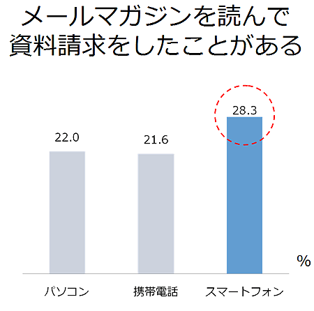 続いて「メールマガジンを読んで資料請求をしたことがありますか?」という質問に対しては、スマートフォンでメールを読んでいる人は28.3%とパソコンで読んでいる人よりも、6.3ポイント高いという結果になっています。