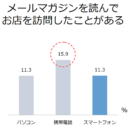 一方で「メールマガジンを読んでお店を訪問したことがありますか?」という問いに対しては、携帯電話が15.9%と、パソコン、スマートフォンを上回っています。