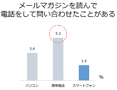 また、「メールマガジンを読んで電話をして問い合わせたことがありますか?」という問いにおいても、携帯電話が最も高い結果となっています。