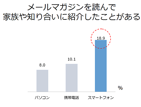また、「メールマガジンを読んで家族や知り合いに紹介したことがありますか?」という質問に対しては、パソコン8.0%、携帯電話10.1%に対して、スマートフォンでメールを読んでいる人は18.9%と圧倒的に高い結果となっています。