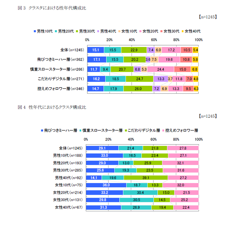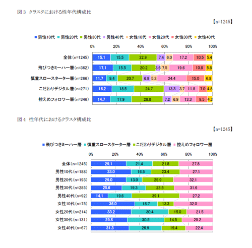 各クラスタの性年代構成比を見てみると、「飛びつきミーハー層」は、10代の割合がやや多く、年齢が高くなるにつれ出現率は低くなる傾向が見られます。「慎重スロースターター層」は、女性の割合が最も多く、女性20代、30代に多いことが特徴となっています。「こだわりデジタル層」は、男性の割合が最も多く、男性20代、40代に多いことがわかります。「控えめフォロワー層」は、やや男性の割合が多く、男性20代、30代に多いことがわかりました。
