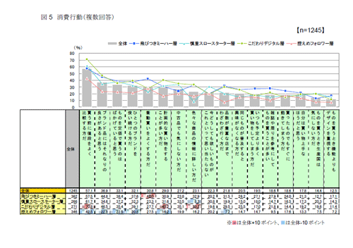 消費行動における各クラスタの特徴を見てみると、「飛びつきミーハー層」は、「衝動買いをする」(42%)、「予定より多く買う」(27%)や「雑誌や周りを参考にして買う」(28%)などの回答が他クラスタに比べ多く、流行に敏感で消費意欲が高いことがわかります。