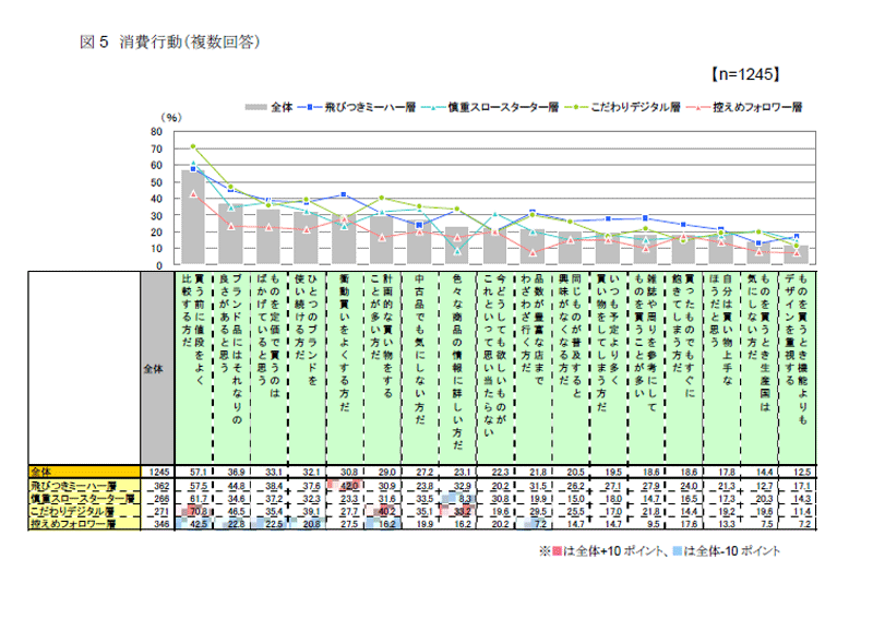「控えめフォロワー層」は、「品数が豊富な店まで行く」(7%)との回答は少なく、消費に対して消極的に捉えていると想像できます。