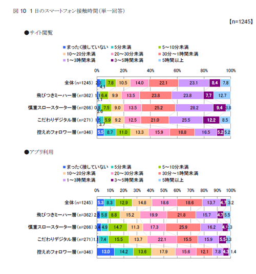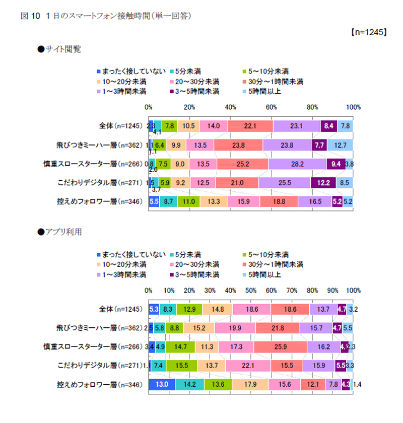 1日にスマートフォンでサイトを閲覧している時間、アプリを利用している時間をクラスタ別に見てみると、「飛びつきミーハー層」「こだわりデジタル層」では、「3時間以上」との回答がサイトでは約2割、アプリでは約1割とヘビーユーザーが他クラスタに比べ多いことがわかりました。また、「控えめフォロワー層」は、サイト、アプリともに接触している時間が少ない結果となりました。