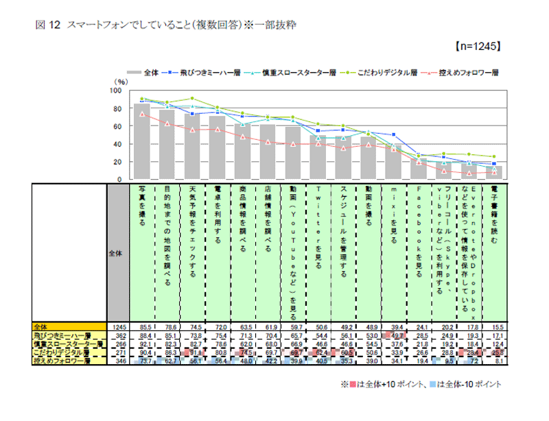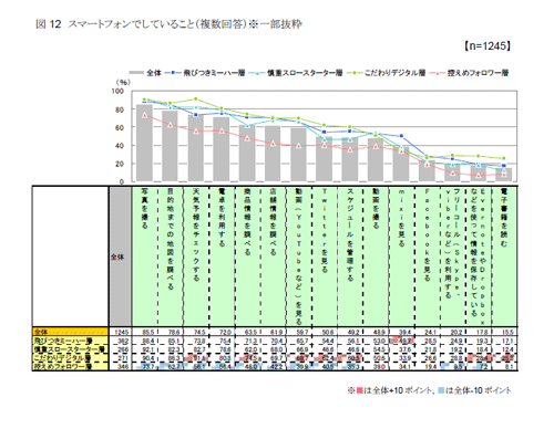「こだわりデジタル層」は、ほとんどの項目において回答率が高く、さらに「フリーコールを利用する」(29%)、「EvernoteやDropboxを利用する」(28%)との回答が多く、リテラシーの高さが伺えます。「控えめフォロワー層」は、ほとんどの項目において他クラスタよりも低く、スマートフォンをあまり使いこなせていない様子が伺えます。