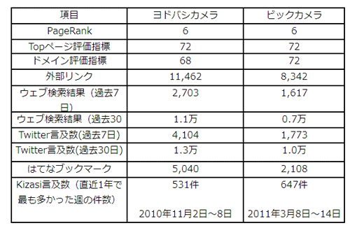 最後に言及数が多かった週という観点で見ると、時期や件数も違う事がわかります。ヨドバシカメラは「京都店がオープン」という話題で、ビックカメラは「震災に伴い無線LANを無料で開放」という話題で言及数が高かった事がkizasi.jpを見るとわかります。しかし見た限り、目立った違いというのは見つかりません。拮抗しているサイト同士という事が改めてわかります。