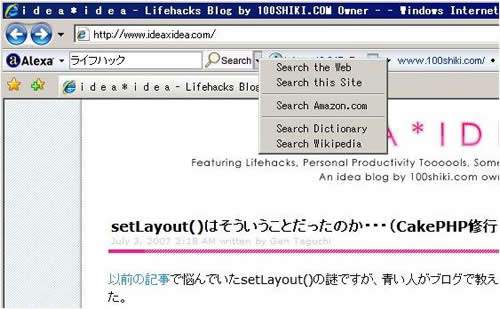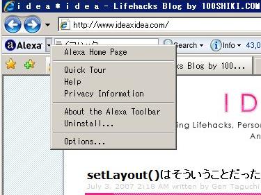 左端のAlexaロゴをクリックすると、Alexa.comに飛びます。また、その右側にある矢印のプルダウンメニューからは、ツールバーの概要(Quick Tour)、ヘルプ(Help)、プライバシーポリシーなどのページへジャンプすることができます。