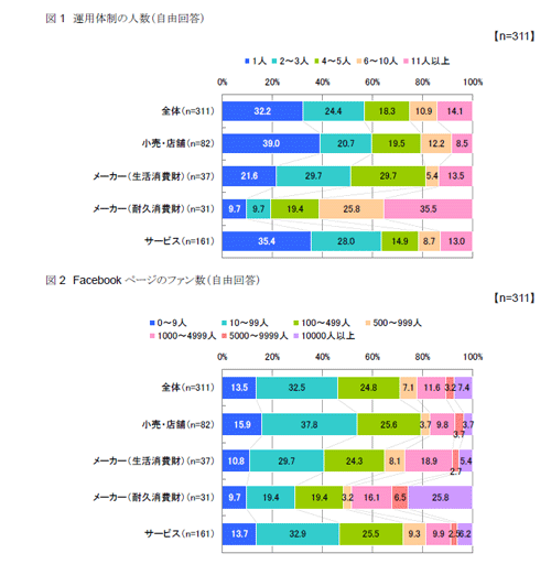 また、Facebookページのファン数を尋ねたところ、「99人以下」との回答が過半数を占め、「1000人以上」との回答は22%にとどまっており、小規模なFacebookページが多数存在していることがわかります。業種別に見てみると、『メーカー(耐久消費財)』では「10000人以上」との回答が26%、「500人以上」では、約半数を占め、他業種に比べ最も規模が大きい結果となりました。