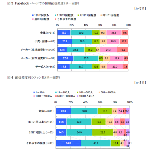 Facebookページでの情報配信頻度を尋ねたところ、「1日に1回以上」との回答は49%となり、半数の企業が毎日情報を発信していることがわかりました。業種別に見てみると配信頻度が最も高いのは『メーカー(耐久消費財)』、もっとも低いのは『メーカー(生活消費財)』という結果となりました。また、情報配信頻度別にファン数を見てみると、配信頻度が高いほどファン数は多い傾向にあり、配信頻度とファン数に相関関係があることがわかります。