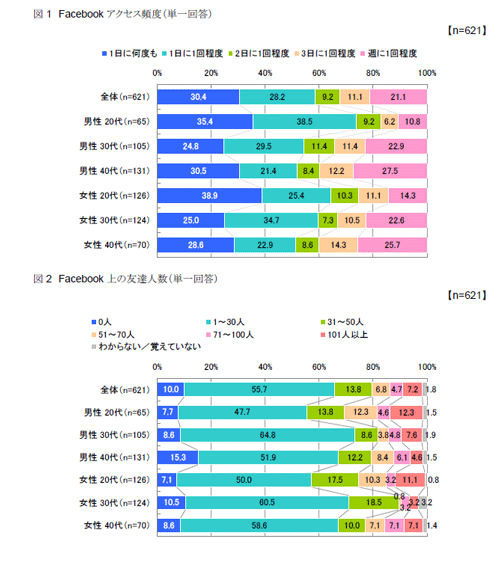 また、Facebook上に何人の友達がいるか尋ねたところ、「30人以下」との回答が6割以上を占めており、「101人以上」との回答は約1割にとどまりました。性年代別に見てみると、男性20代、女性20代の友達人数が多いため、発言や「いいね!」などが広まりやすく、バイラル効果が期待できる世代であると推察できます。