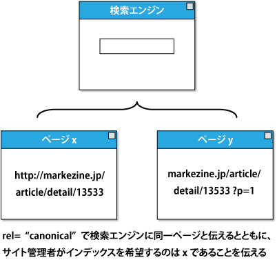 いずれのURLでもアクセスすることができる。両者の違いは、パラメーターp=1(ページ番号を指定する)の違いだ。この場合は、http://markezine.jp/article/detail/13533を正として、rel="canonical"でhttp://markezine.jp/article/detail/13533を指定する。つまり、検索エンジンに両者が同一ページであると共に、サイト管理者がインデックスを希望するのはxであることを伝える。