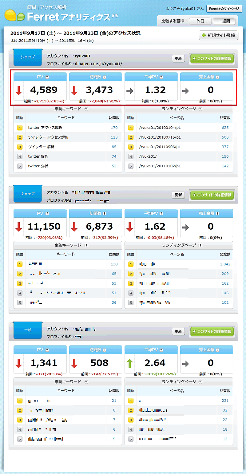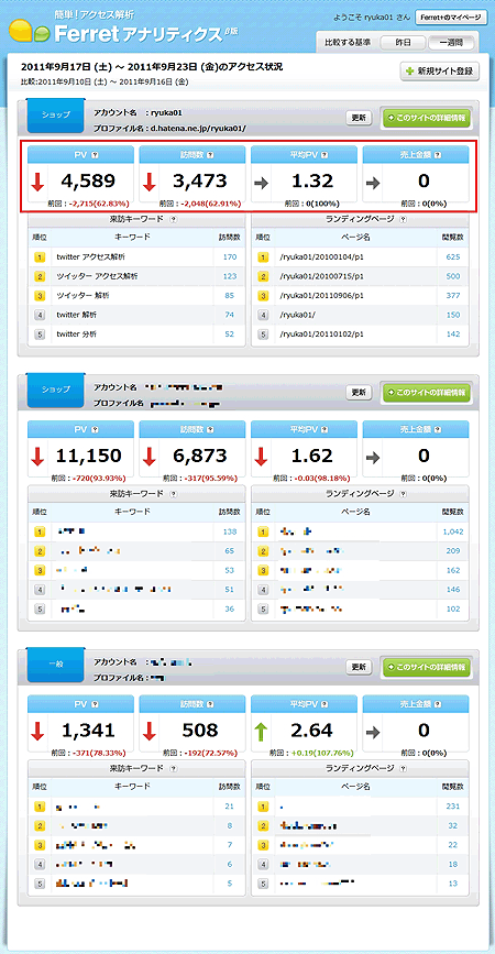 それでは、表示されているレポートを確認してみましょう。基本的な指標である「PV」「訪問者」「平均PV」とコマース変数を設定している場合は「売上金額」が表示され、更に上位5つのキーワードやランディングページが表示されます。また、基本的な指標は1週間あるいは前日との比較ができ変化が一目で確認できるので、この画面で自社サイトの状況がぱっと掴めます。(上記画像の赤枠画面)