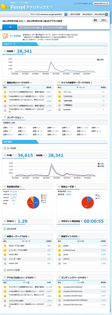 - 「基本指標」(PV数・訪問数・来訪者の内訳・新規ユーザ率・平均PV・平均サイト滞在時間・検索キーワードTOP5・参照サイトTOP5・アクセスの多いページTop5・ランディングページTop5)
