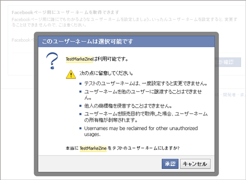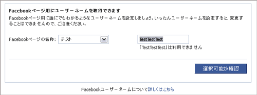ただし、すでにほかのFacebookページで使用されている場合もあります。「選択可能か確認」できます。使用できる場合も、一度設定したら変更できないので、ミスがないよう注意が必要です。