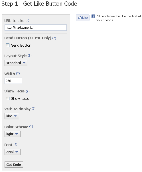 相手を選んで「いいね!」を送る、Sendボタンを設置するかを選びます。SendボタンはJavaScript対応が必要です。2011年10月現在、まだほとんどのサイトが対応していないので、初心者マーケターはチェックを外して問題ないでしょう。
